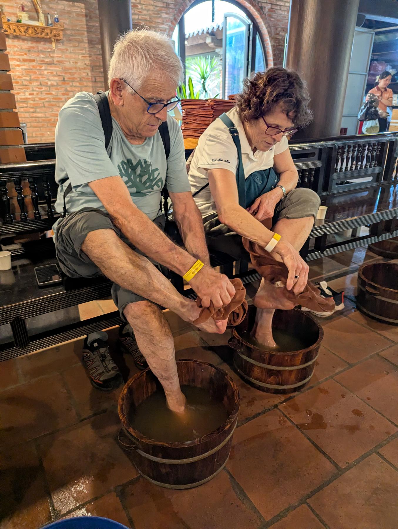 Salen derrotados, conozco la sensación… hoy casi no hemos comido… me dicen que necesitan un cafecito y picar algo. Les pido ubicación y les digo que me acerco a donde vayan. Pero se sientan en uno dentro del recinto… sin agobios, les espero fuera. Cuando aparecen, se les ve revividos… un café y un croissant obró el milagro. Bien contentos, pero al igual que yo, piensan que ha esta pelicula le sobraba una hora de metraje. Aviso al conductor por WhatsApp, y al poco aparece. Seguimos rumbo a Hang Mua.