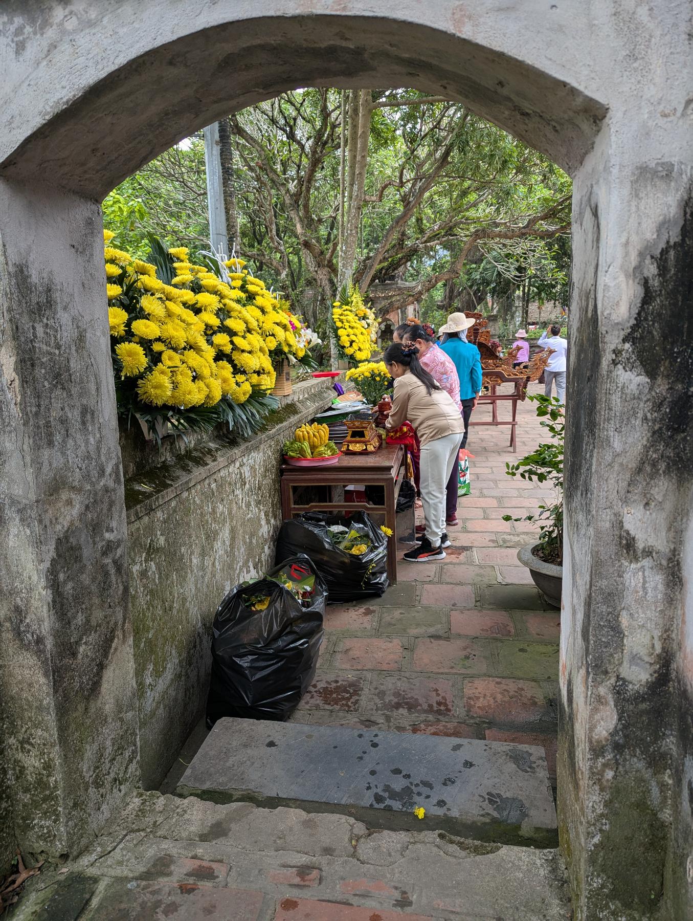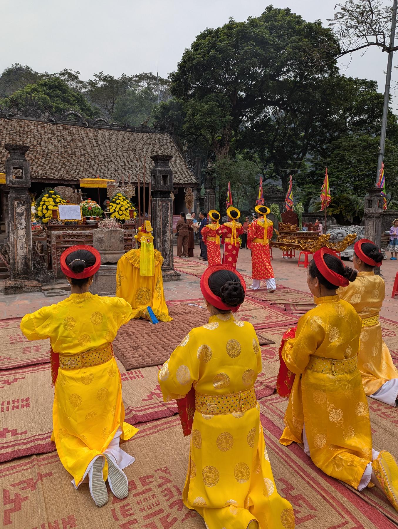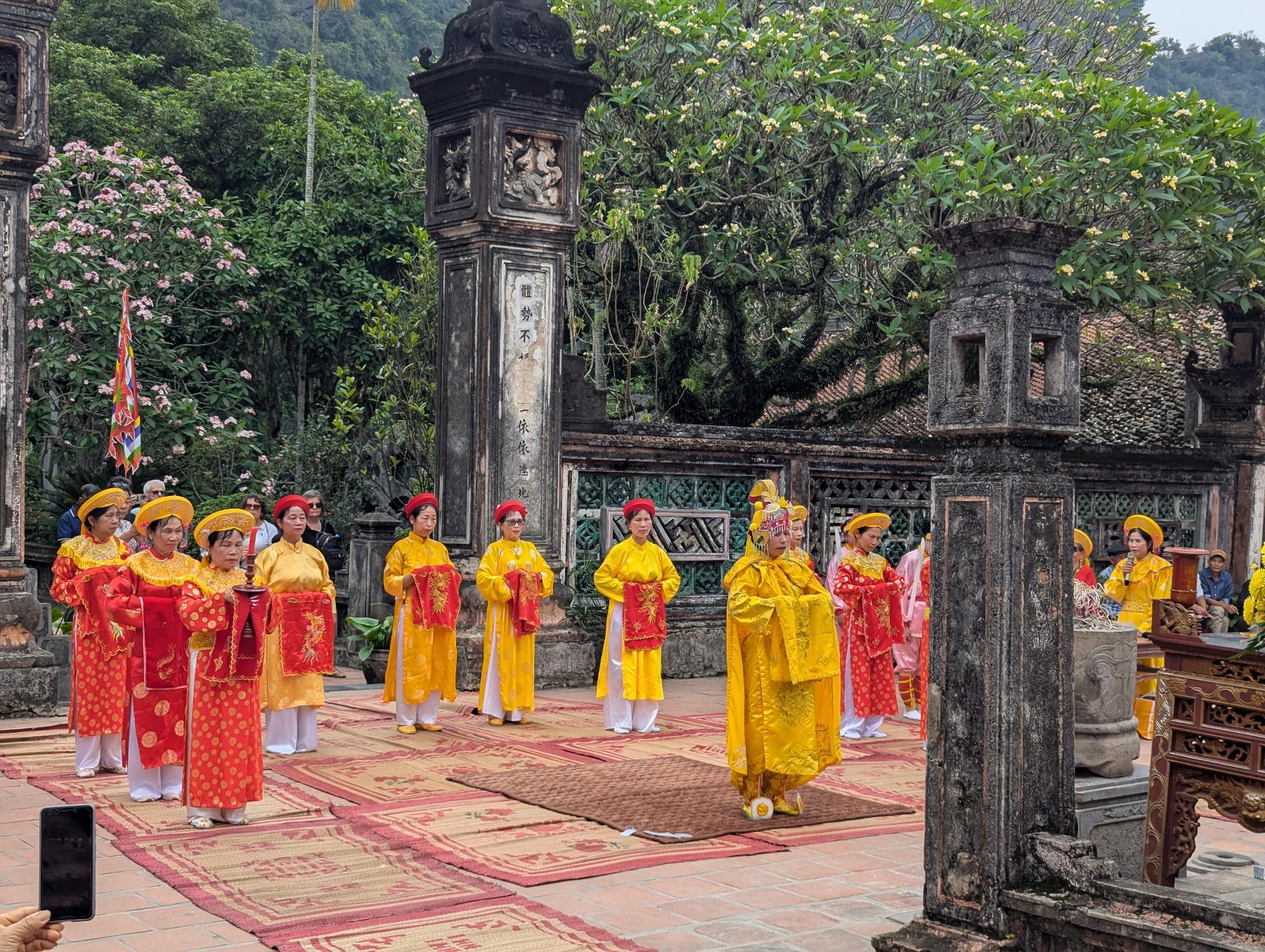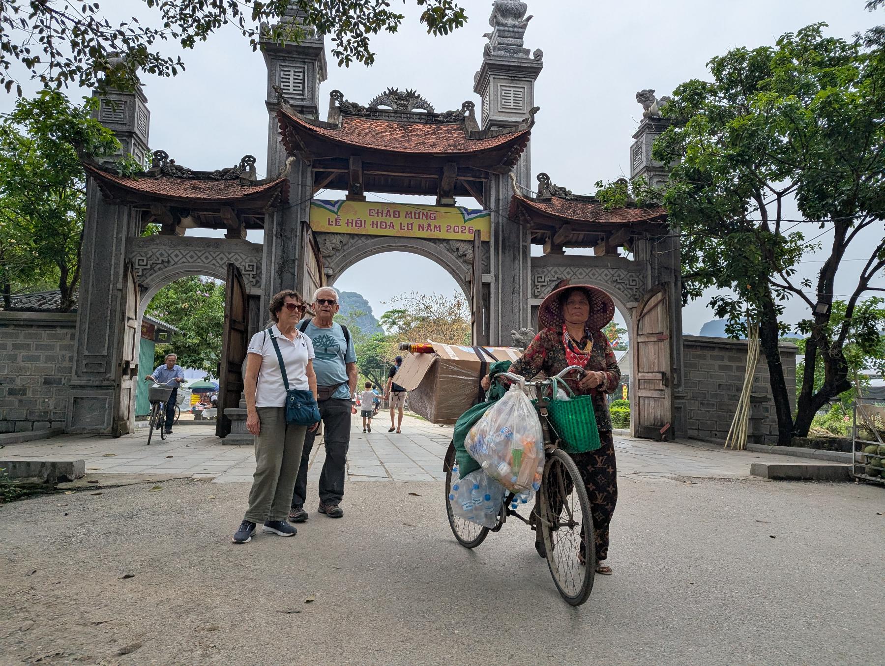 Nuestra siguente parada es Hoa Lu. Aqui estuvo la primera capital del Vietnam unificado, allá por el siglo X, cuando los reyes Dinh y Le eligieron este lugar no por casualidad, sino porque las montañas kársticas funcionaban casi como una muralla natural. Hoy queda poco de aquella capital antigua, pero el paisaje lo explica todo… templos bajos, piedra oscura, puertas solemnes y esas montañas verticales cerrando el horizonte como si todavía protegieran algo.