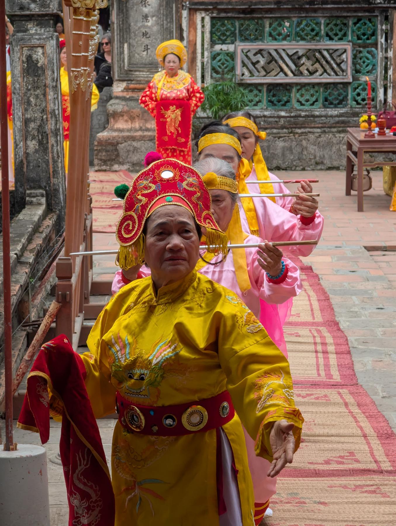 Sin embargo hoy no es el sitio solemne para visitar despacio de hace 2 años, ya que se aproximan las fiestas y está todo lleno de carpas y escenarios. Tenemos la suerte de ver en directo un ceremonial, antes de seguir visitando otros templos dispersos por la zona.