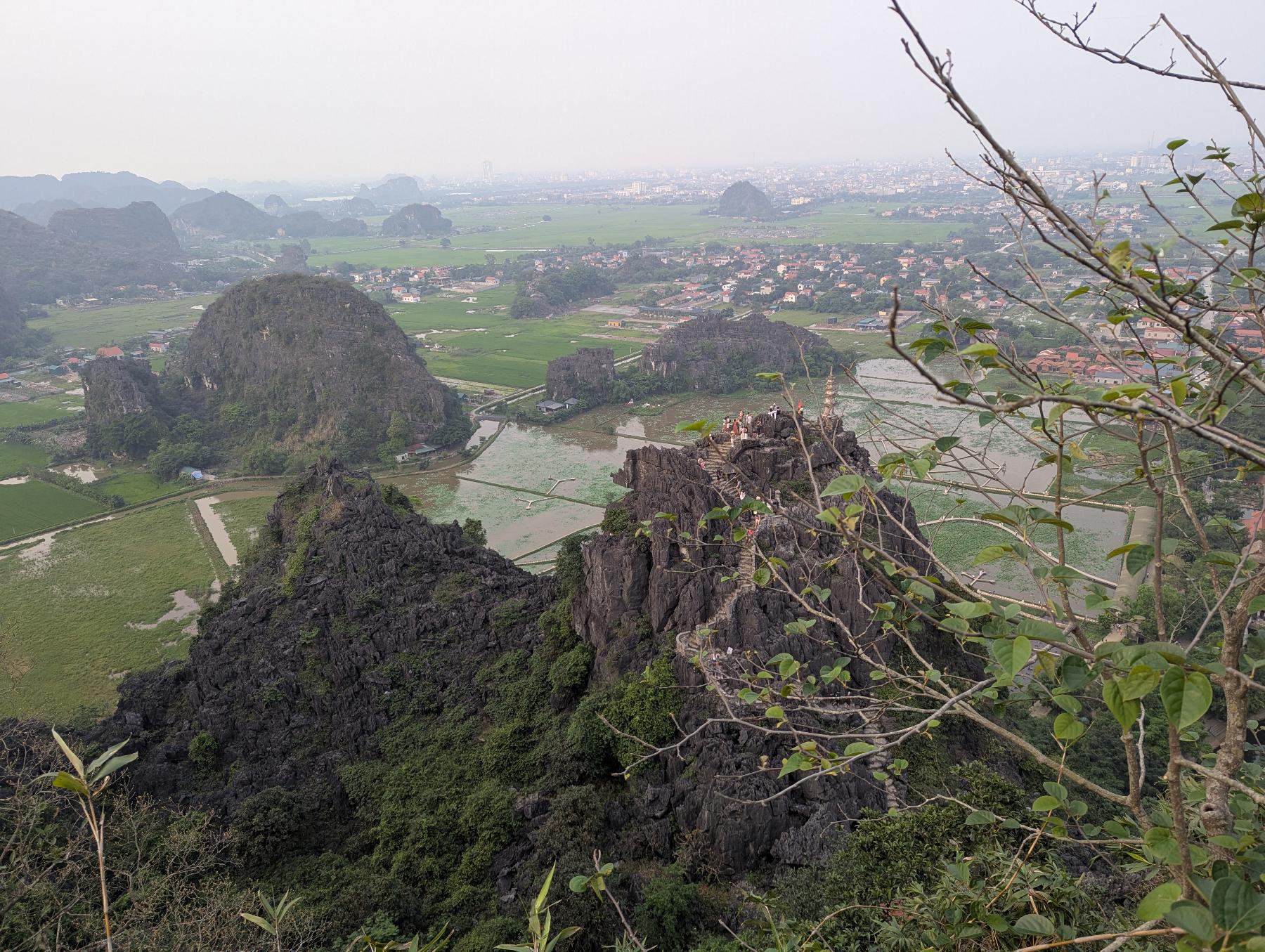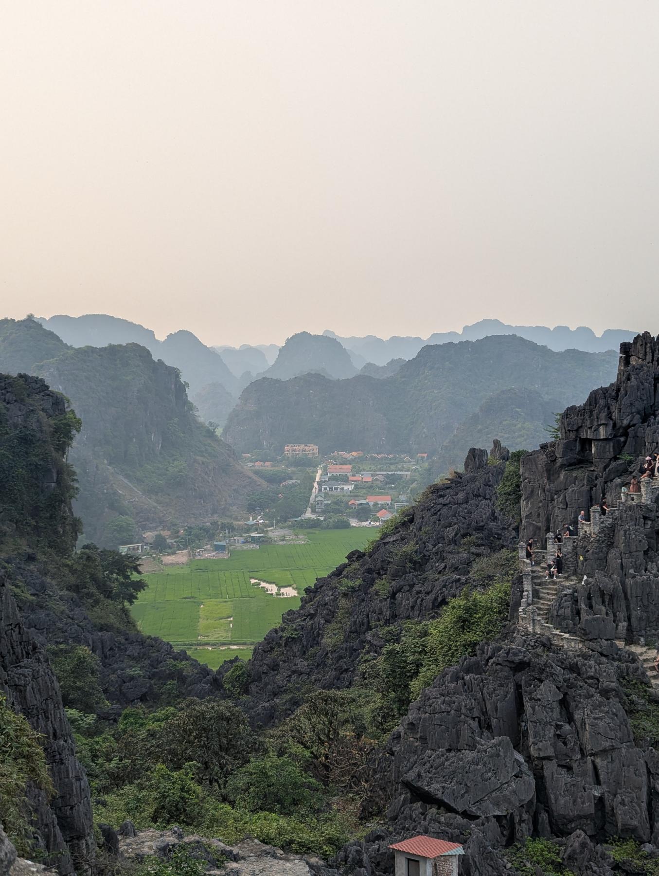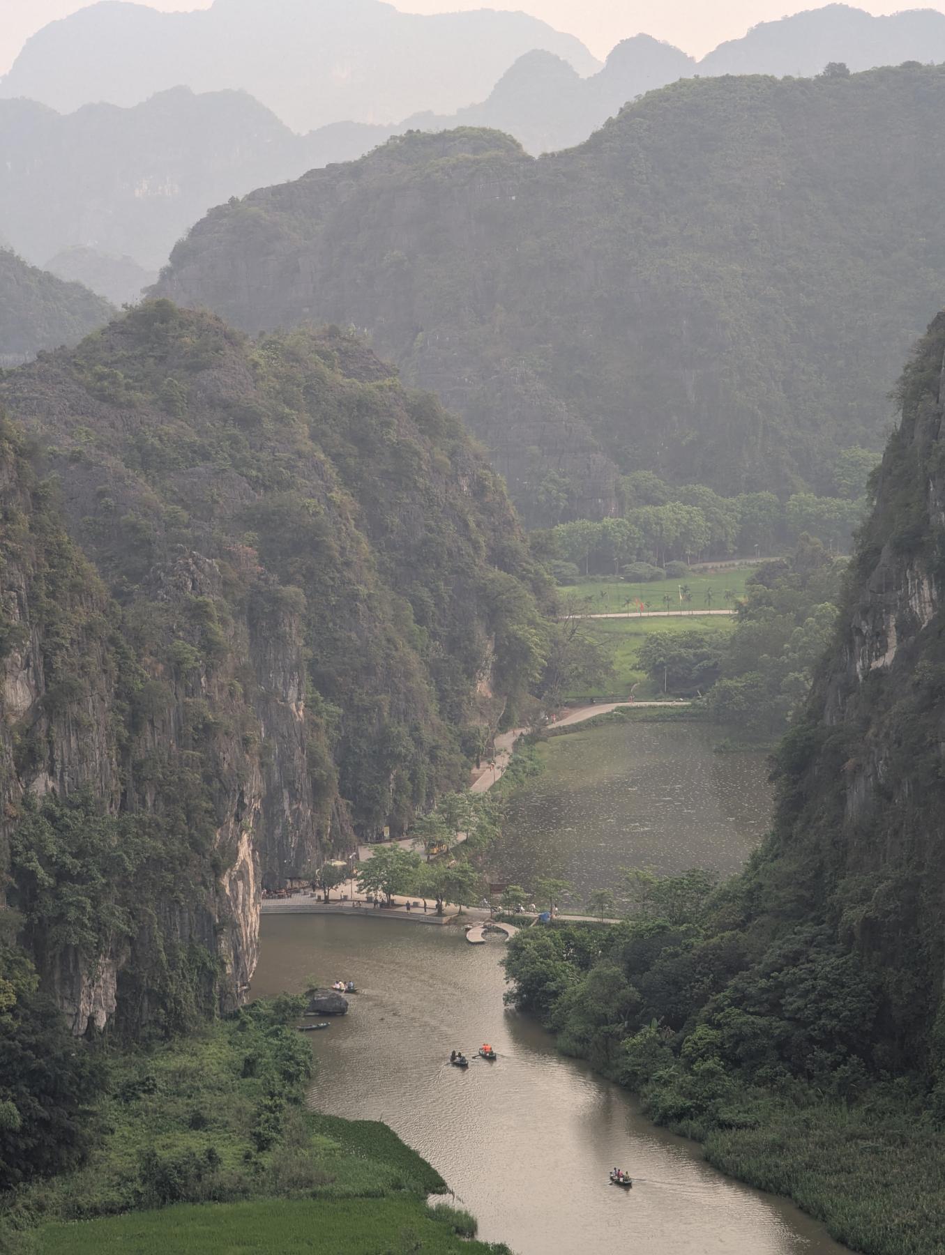 Hang Mua, aunque el nombre hace referencia a la cueva que tiene en la base, realmente hemos venido para subir el peñazco en el que se encuentra, ya que su escalera de más de 500 escalones, de dura pendiente, lleva hasta uno de los miradores más conocidos de Ninh Binh. Desde arriba se ve el río Ngo Dong serpenteando entre arrozales y montañas kársticas, con Tam Coc extendiéndose entre ellas como un manto verde.