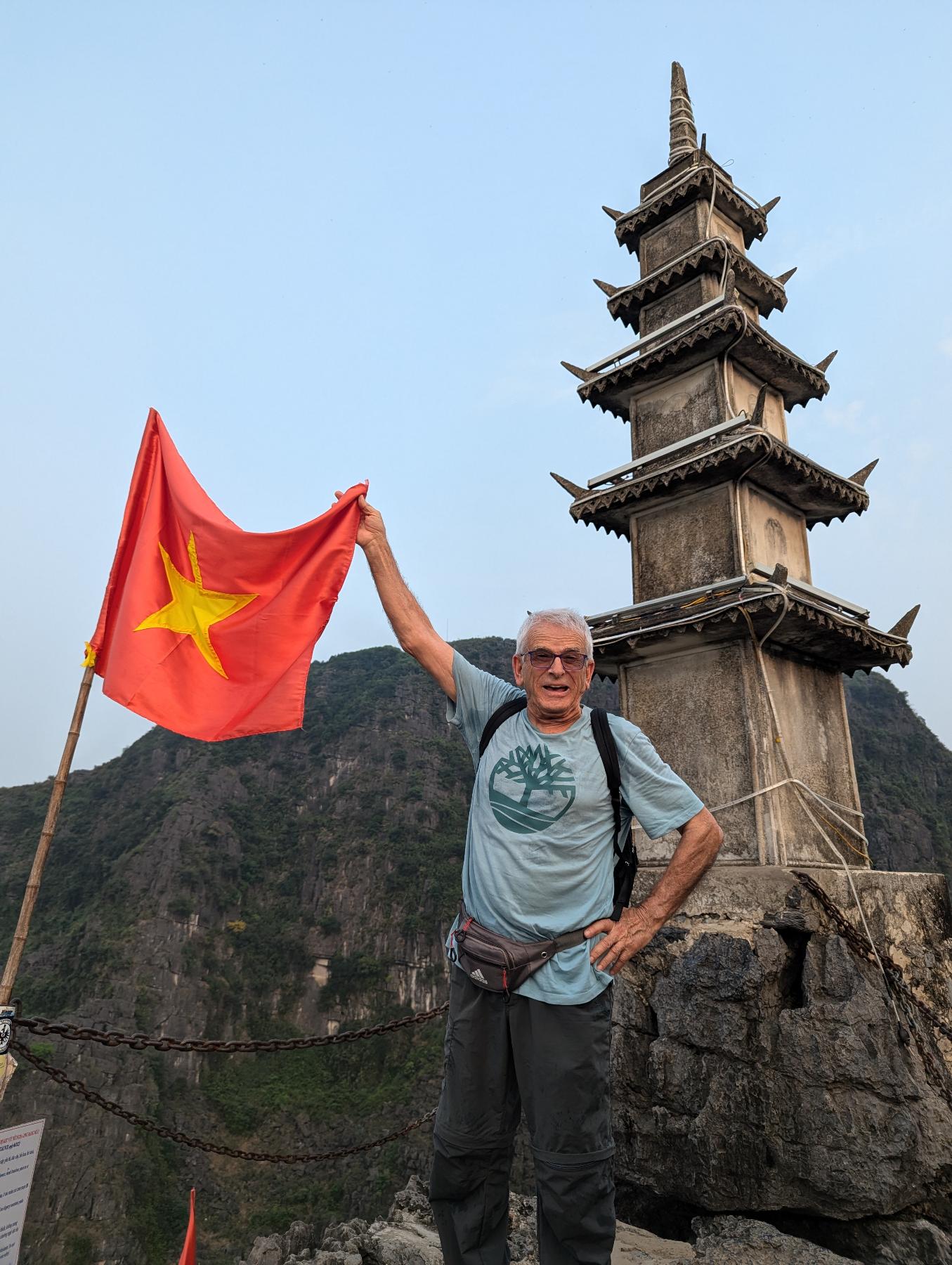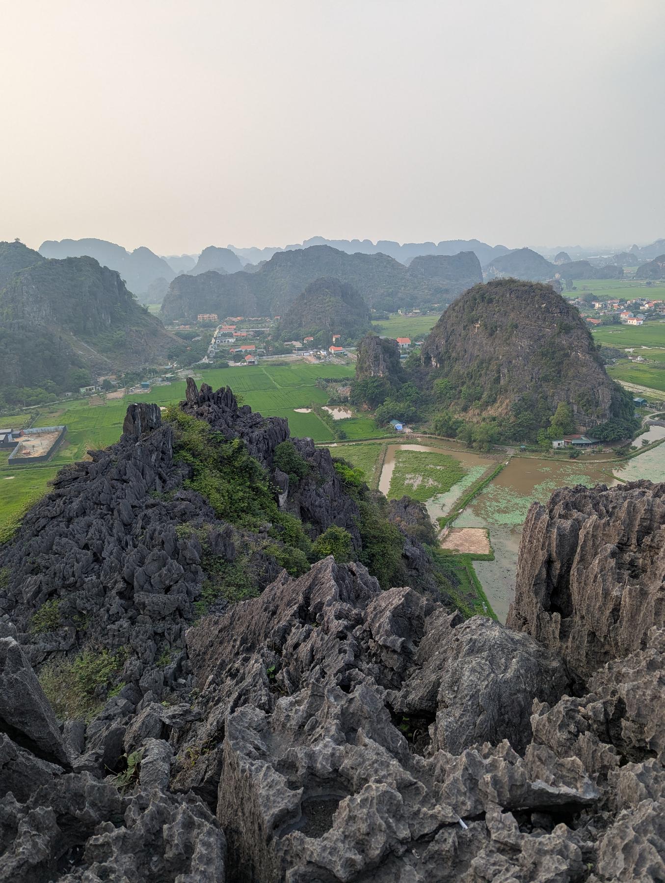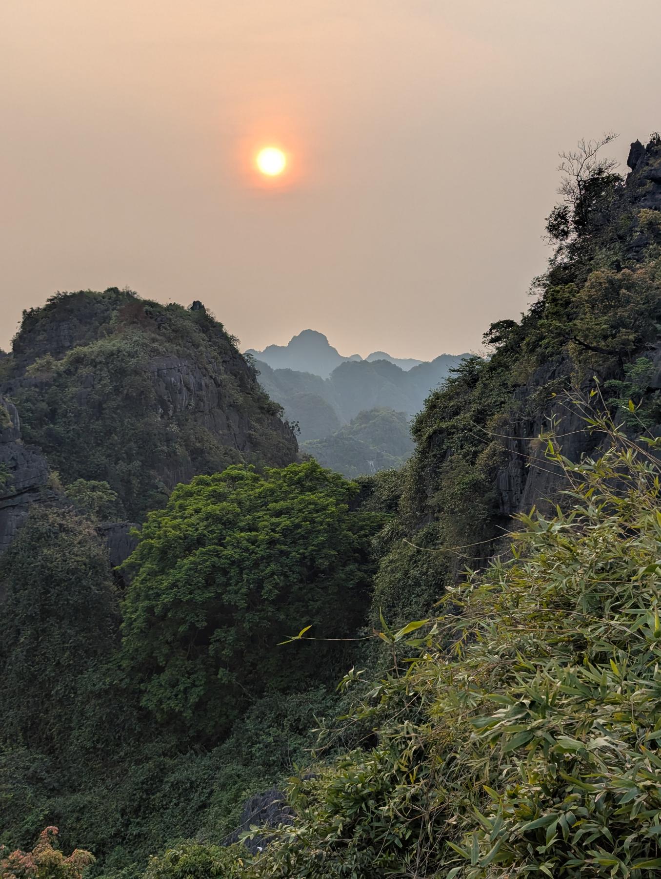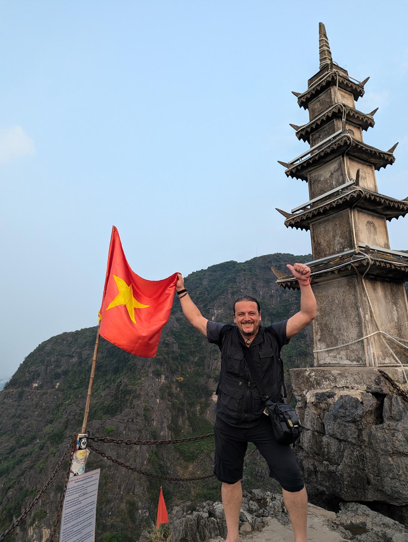 Hang Mua, aunque el nombre hace referencia a la cueva que tiene en la base, realmente hemos venido para subir el peñazco en el que se encuentra, ya que su escalera de más de 500 escalones, de dura pendiente, lleva hasta uno de los miradores más conocidos de Ninh Binh. Desde arriba se ve el río Ngo Dong serpenteando entre arrozales y montañas kársticas, con Tam Coc extendiéndose entre ellas como un manto verde.