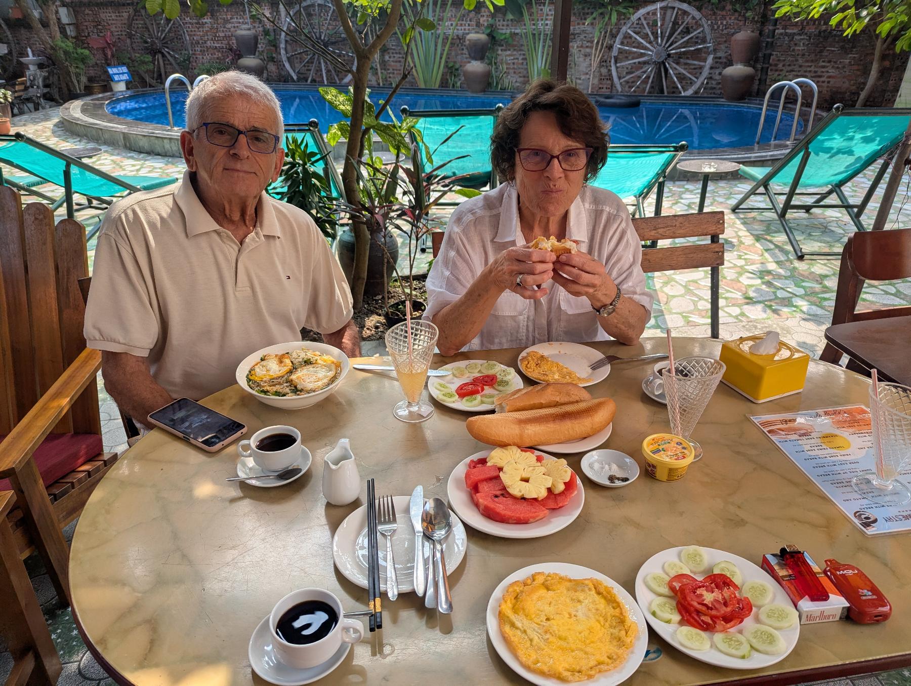 Me despierto poco antes de que suene el despertador de las 8:30, al ir al baño. Me quedo ya en planta. Al salir veo que hoy nos han preparado la mesa que está en el area central frente a la casa de los propietarios. Mis padres están saliendo, aunque seguro que llevan ya un rato despiertos, aun están regulando el sueño. Al poco llega mi padre y detrás la mamma. Mi padre pide sopa de noodles, mi madre y yo tortilla con tomatitos y pepino, todo ello acompañado de zumo, pan y café.