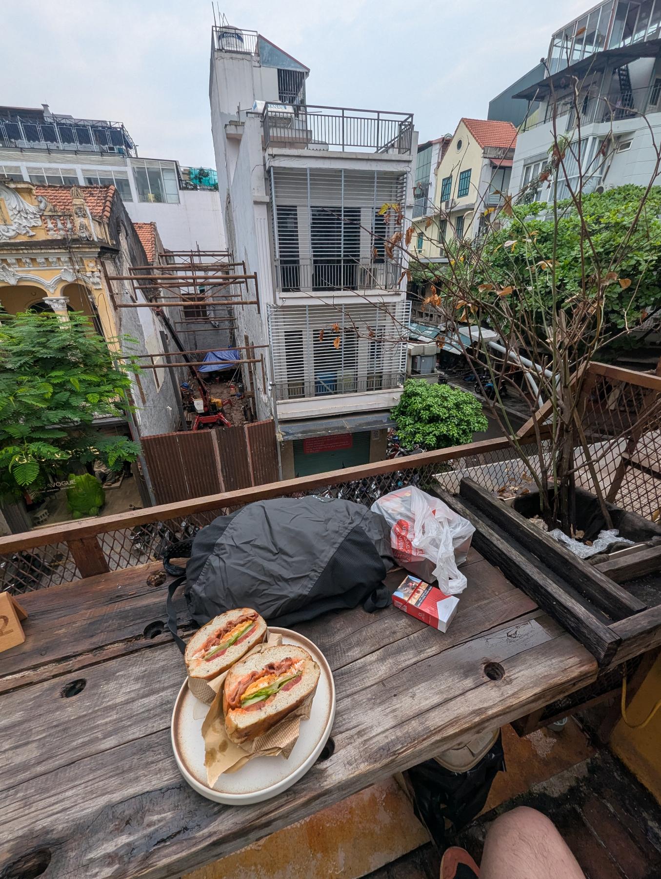 Me pido el típico café con leche condensada (el barraquito vietnamita) y veo unos bocatas con ensalada, huevo y bacón que no me permiten resistirme. Tienen varias plantas, pregunto si puedo fumar y me dicen que en la superior… es una terracita que da a la calle… no hace mucho que ha llovido, espero que no vuelva a llover.