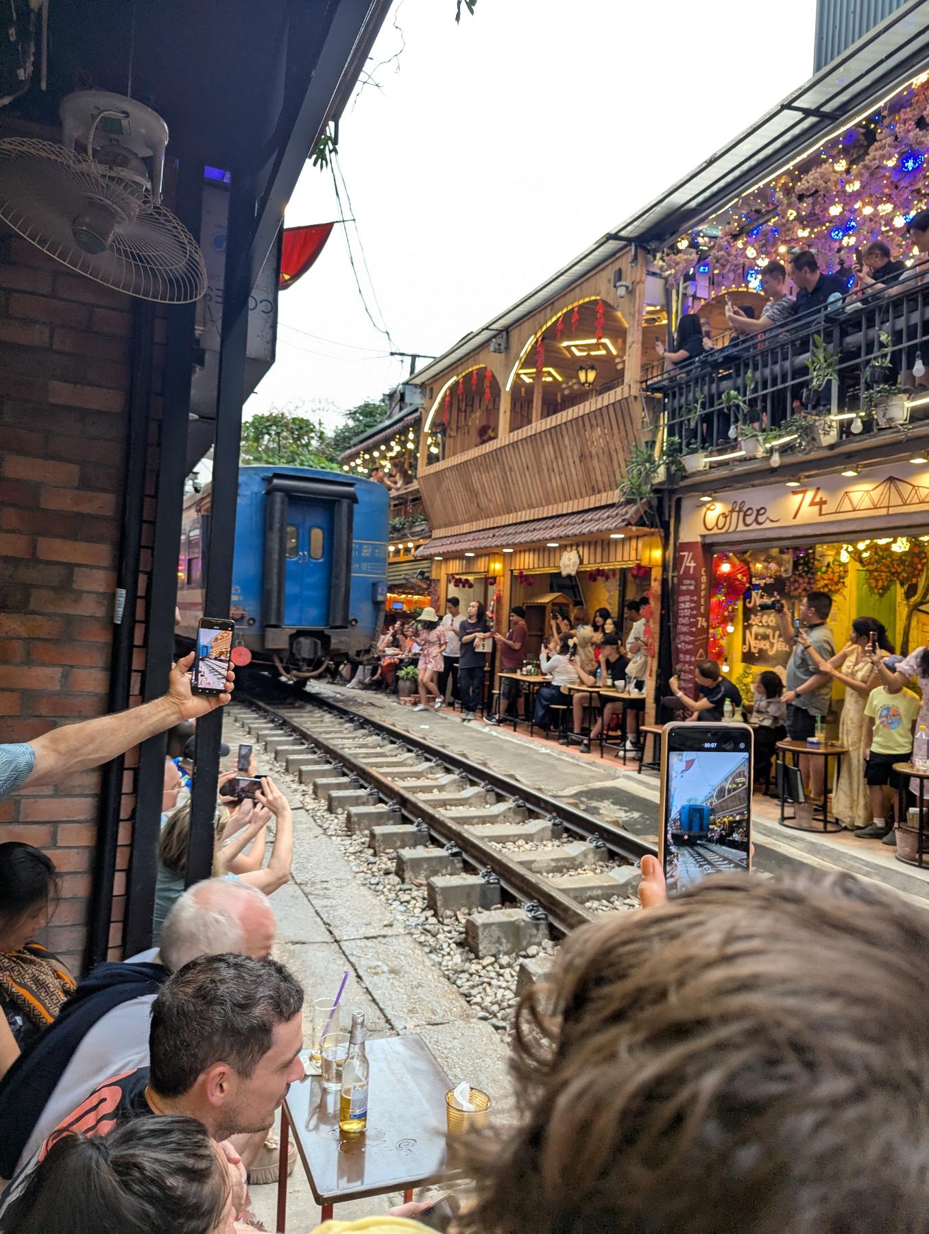 Poco antes de llegar a las vías pasamos por una zona de comidas interesante, unas calles sin circulación y agradables. Falta poco para el tren así que ahora no, pero luego lo mismo podría ser un sitio interesante. Buscamos donde ubicarnos para ver pasar el tren está todo lleno como siempre, pero como siempre hay algún sitio libre y ni tan mal. Pedimos unas cervezas y no tenemos que esperar mucho para verlo pasar. Los responsables de las vias le pegan al silbato para que todo el mundo se aparte y al poco llega. Va despacio, fotos, videos y todo el mundo contento. De allí nos vamos a comer a donde vimos antes.