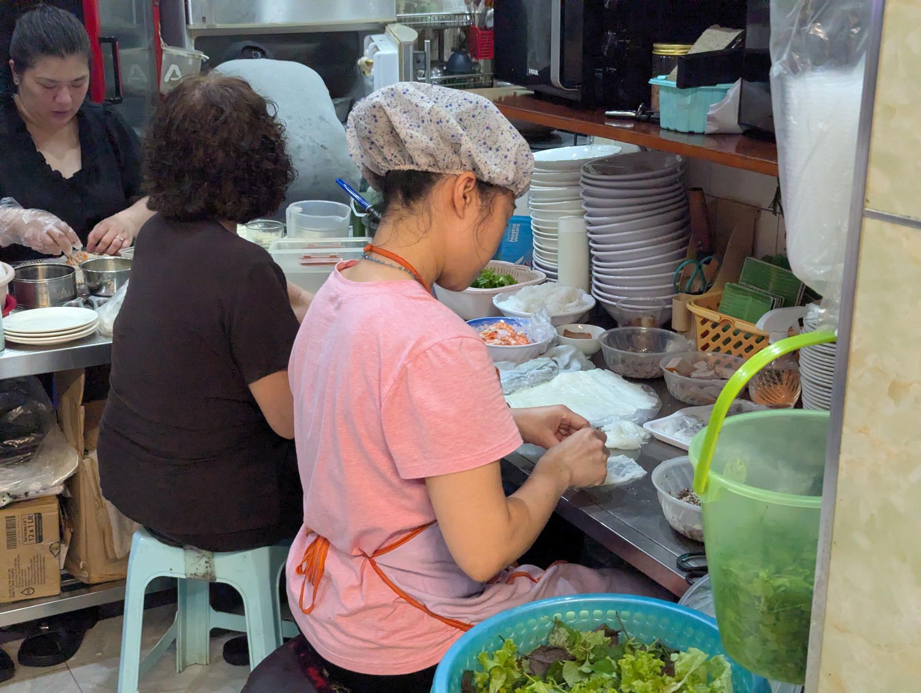 Me doy una vuelta rápida y elijo el sitio que me parece más auténtico. Pedimos varios bun cha, para mis padres, yo una pho con dumplings, y unas verduritas y dumplings fritos para compartir. Está todo muy rico, pero la salsa del bun cha de hoy es más auténtica y sabe más a pescado, y mis padres la encuentran un algo más fuerte…
