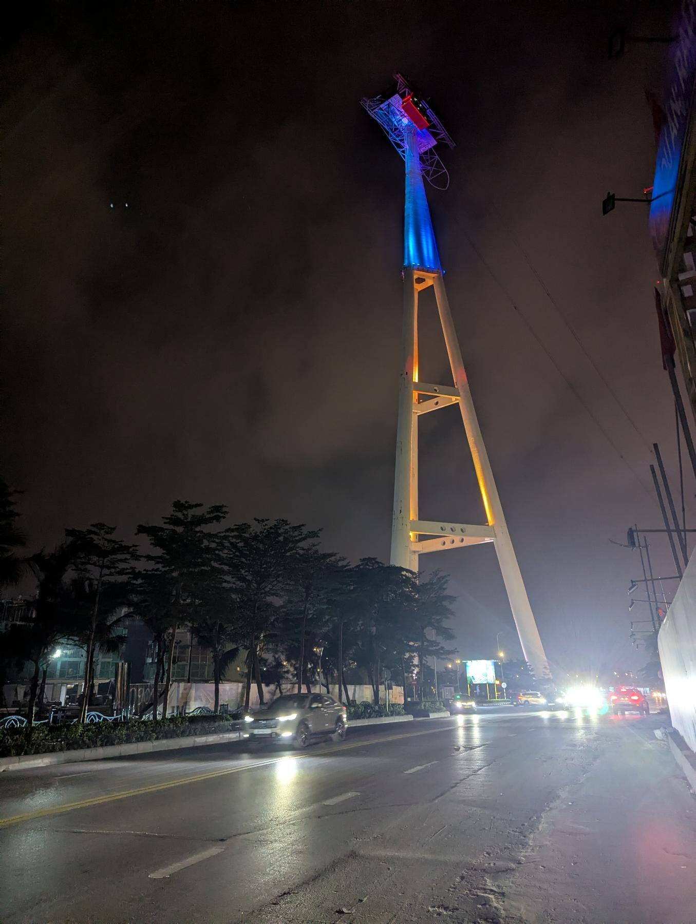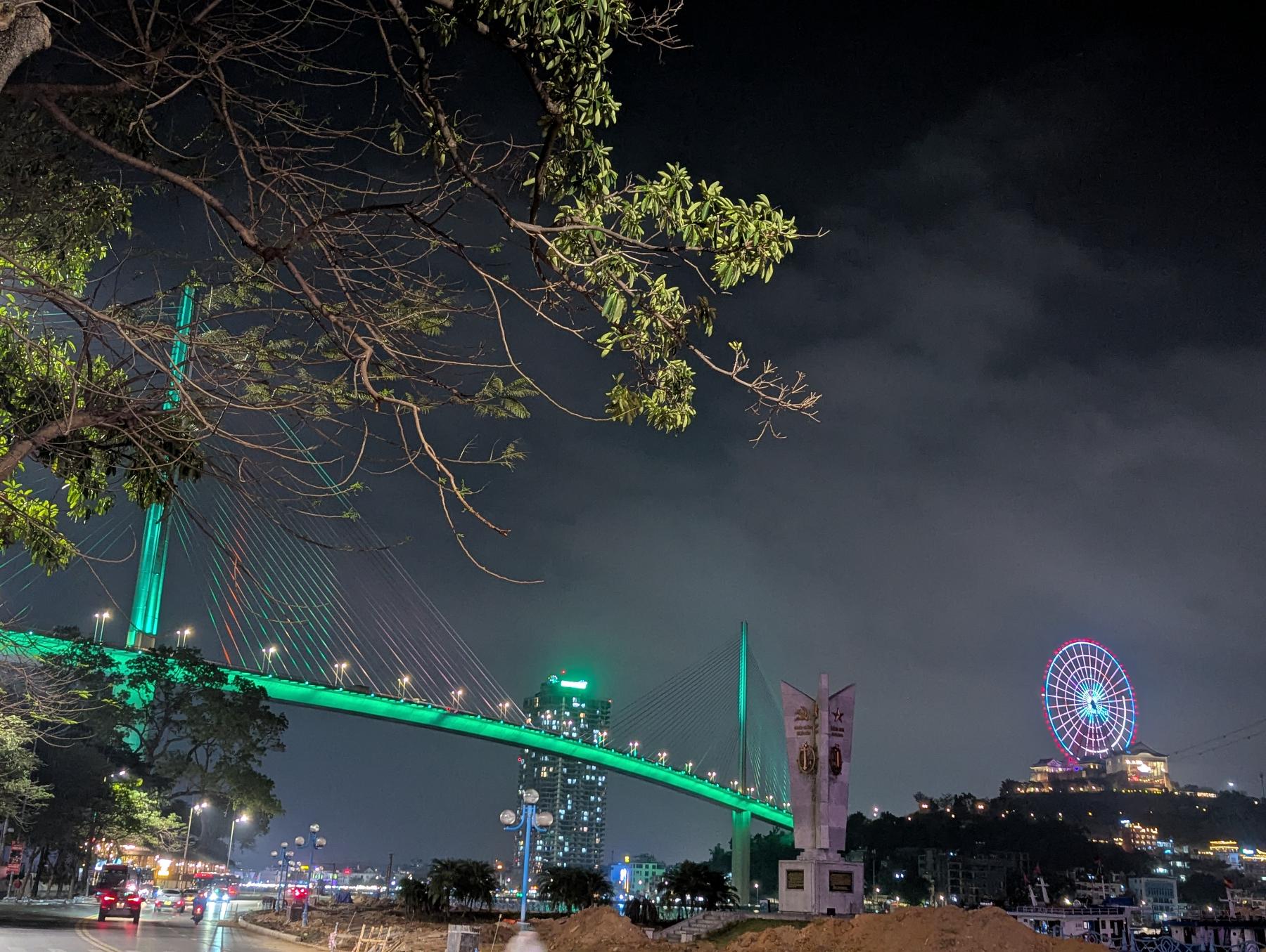 Desando mis pasos y llego hasta la avenida marítima, pero la recorro en sentido contrario al de hoy. Voy hasta el puente que une Bai Chay con Hon Gai. Ya es de noche y está iluminado, y sobre la colina que corona Hon Gai hay una gran noria, que con miles de leds va pintando imágenes, entre otras la bandera vietnamita… que bonita es…